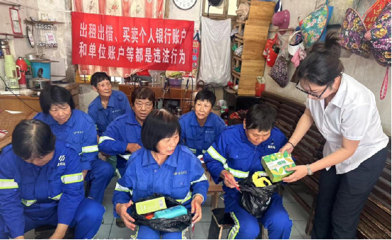 稠州银行丽水分行在社区内设立“爱心冰柜”驿站,为往来居民提供矿泉水、雪糕及防暑物资并发放防暑降温小常识宣传单,提醒大家做好自身防护,安全度夏;稠州银行湖州分行为和平镇街区环卫工人送去防暑用品的同时,还为他们普及防范电信诈骗、反假币、警惕非法集资等金融知识,提醒他们保护个人信息,防范金融风险。