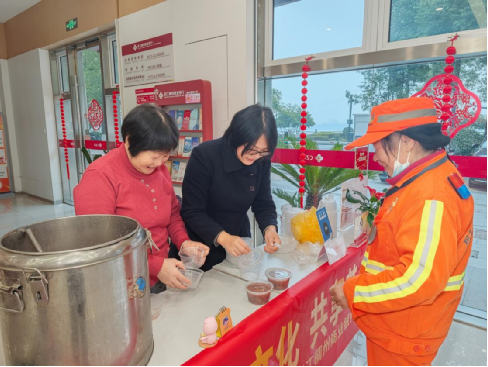 一碗粥成为连接银行与客户的温暖符号。台州分行24家网点同步上演“财神送福”,员工化身“五路财神”端粥送福,让传统民俗焕发新趣;衢州分行在11周年庆之际,将腊八粥与手写春联送给客户,同步开展“幸运大转盘”“一元购”等趣味活动;绍兴柯桥支行为外国友人送上腊八粥,让传统节日成为文化交流的纽带;舟山分行在街头设摊,将粥送到户外工作者手中;丽水分行则将粥送到工地、社区、寺院,让建筑工人、环卫工、香客都在粥香中感受关怀。