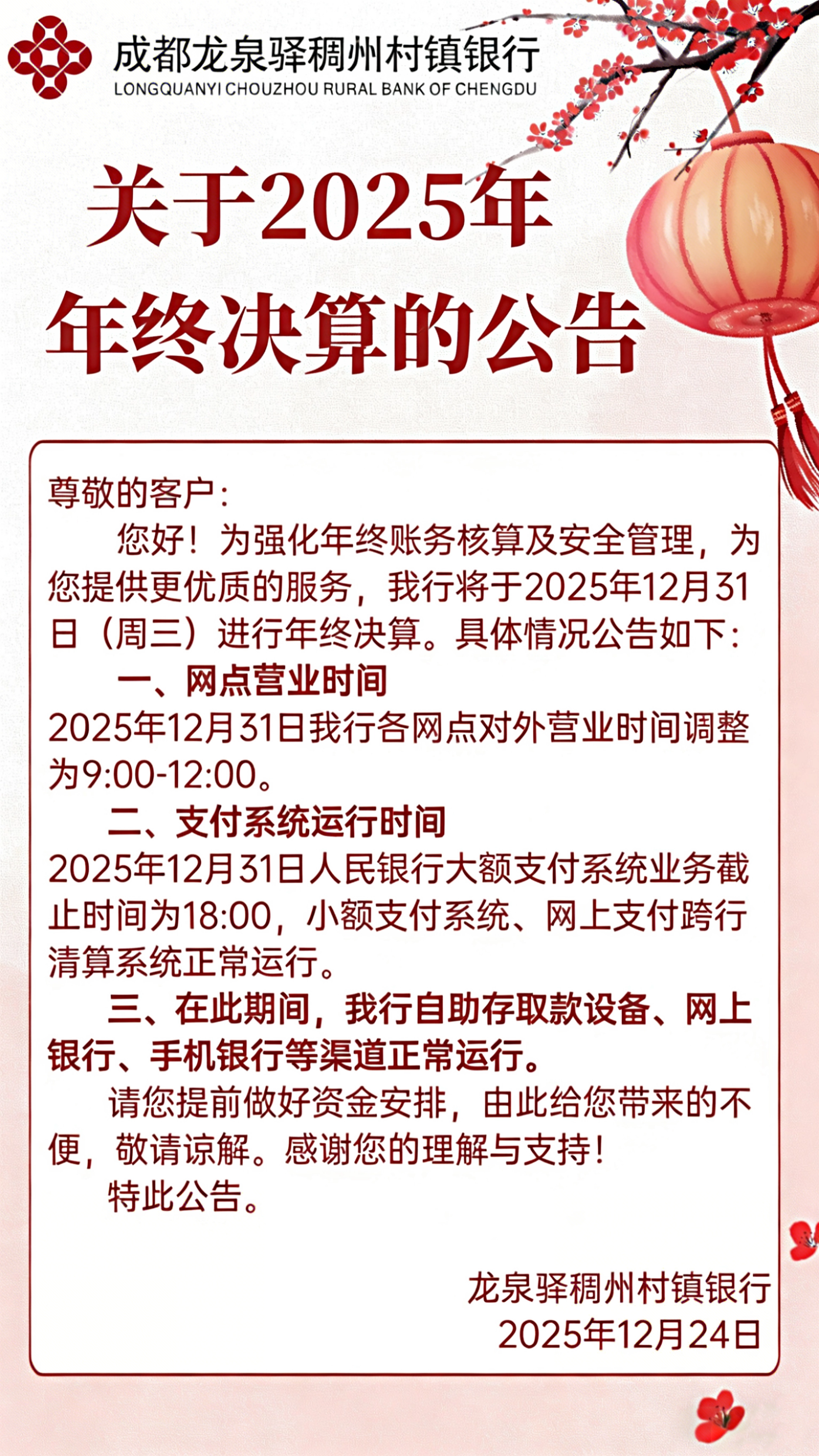 龙泉驿稠州村镇银行关于2025年年终决算的公告
