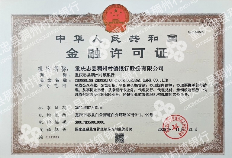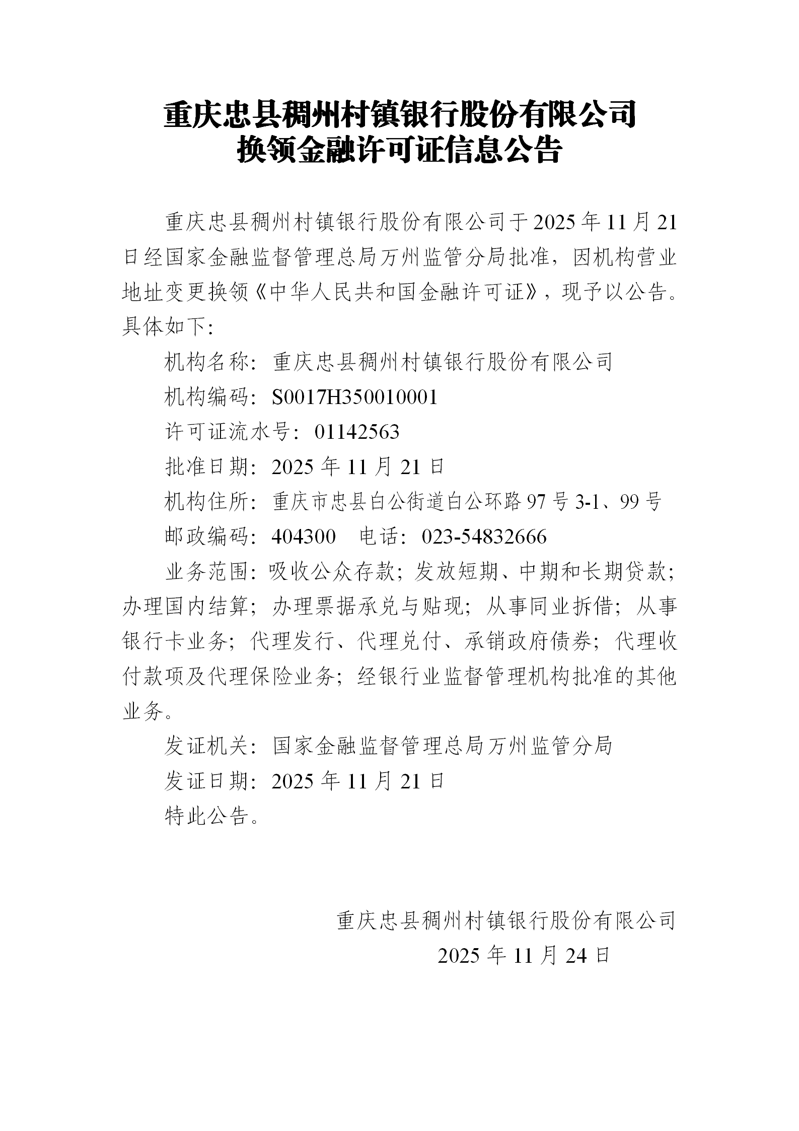 重庆忠县稠州村镇银行股份有限公司换领金融许可证信息公告